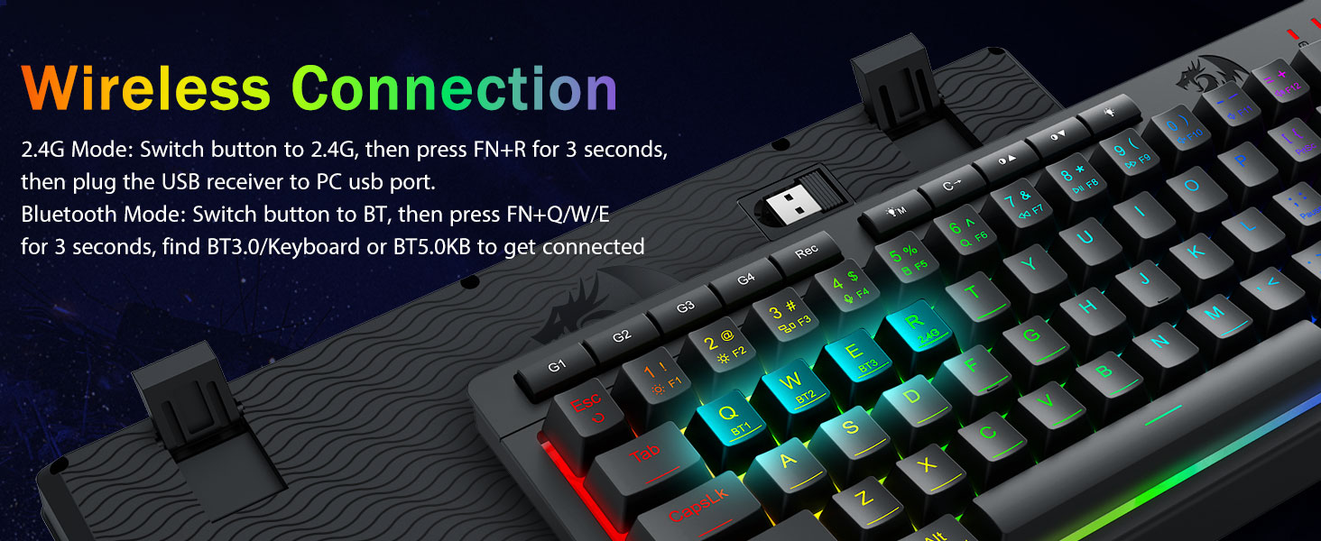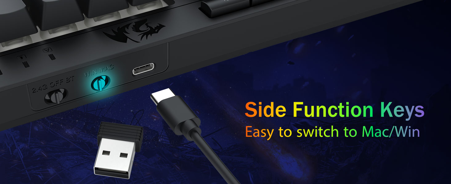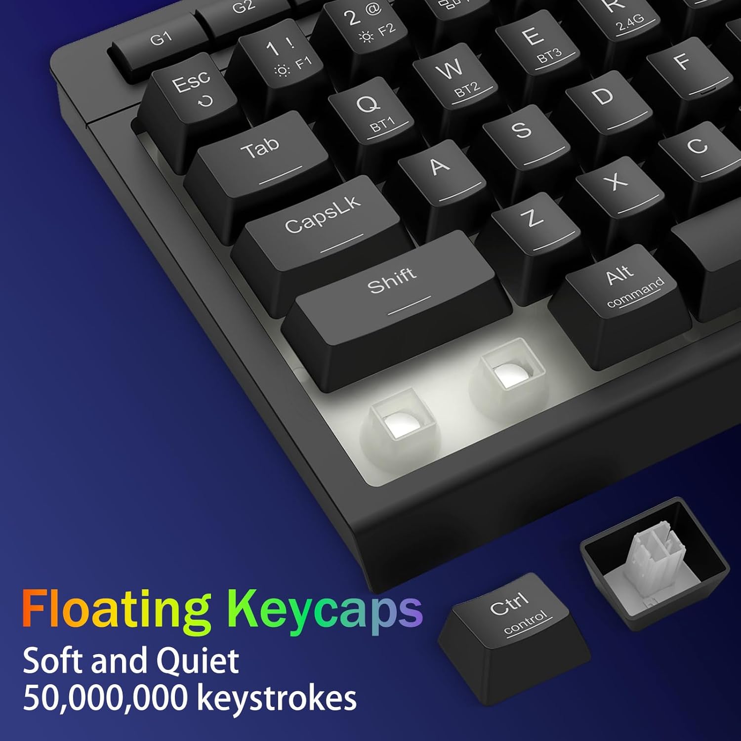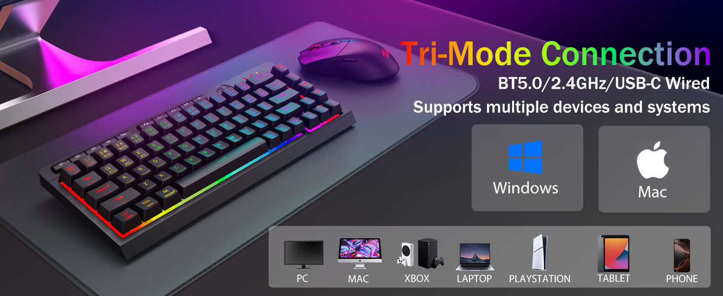 트라이 모드 다양성 및 다중 장치 숙달 -Bluetooth 5.0, 2.4GHz 무선 또는 USB-C 유선 모드 간에 원활하게 전환하여 최대 5개의 장치(PC, Mac, 태블릿, 휴대폰, PS/XBOX)를 동시에 연결할 수 있습니다. 단축키나 측면 버튼을 통해 장치를 쉽게 전환할 수 있어 하이브리드 작업/게임 설정에 적합합니다. 4,000mAh 배터리(30일 이상 대기, 50시간 RGB 런타임)로 몇 주 동안 전원을 유지하세요.