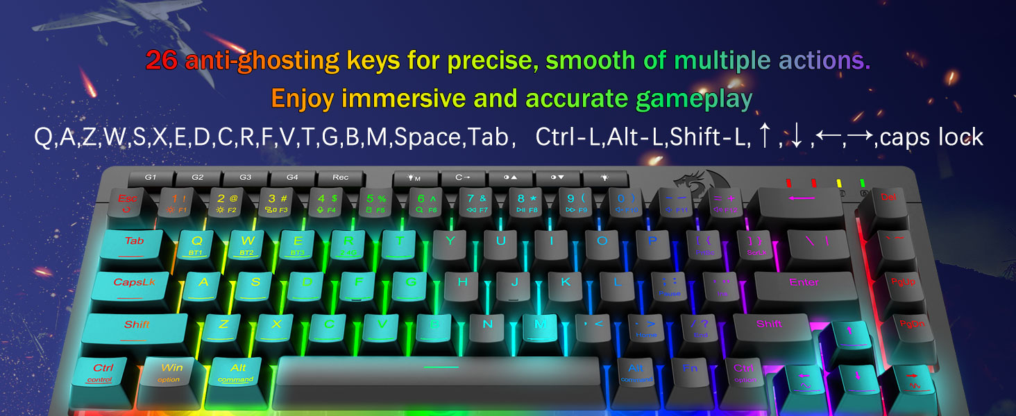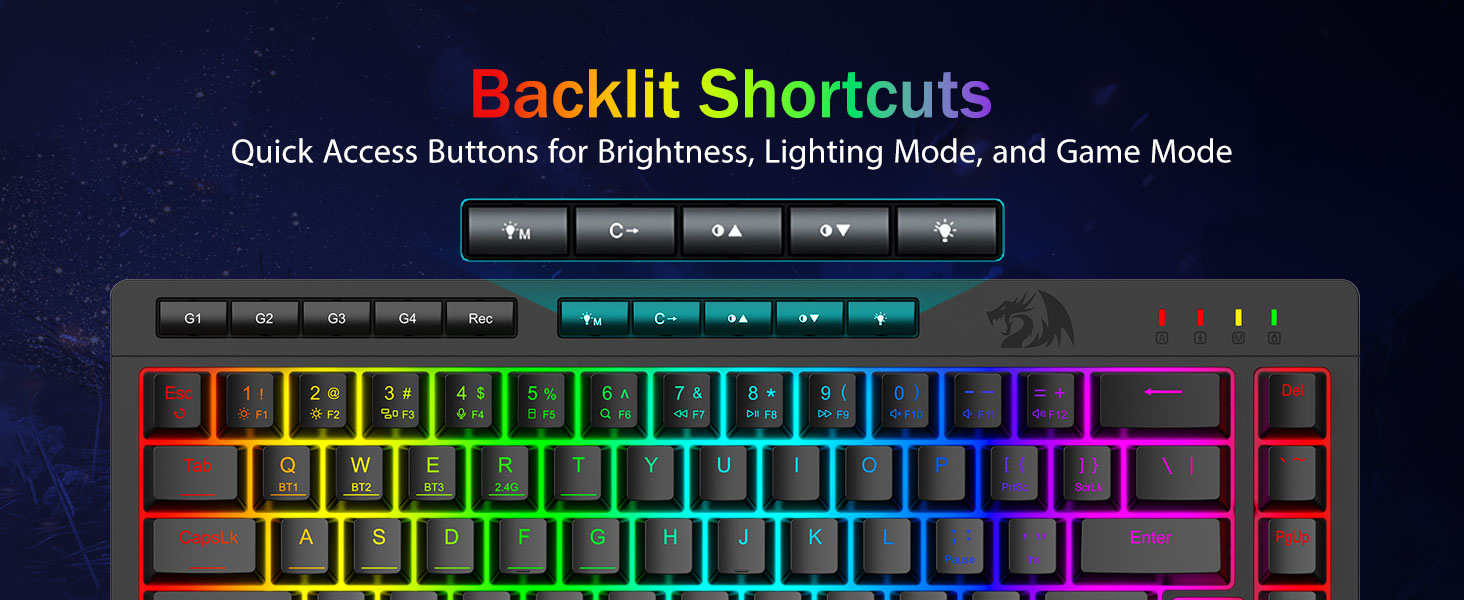 프로급 게임 성능 및 전용 백라이트 컨트롤 -의도한 대로 빠르고 정확한 게임 반응을 위해 26개의 키가 동시에 작동할 수 있는 안티 고스팅 키(밑줄이 있는 키)가 특징입니다. 밝기, 조명 모드 및 게임 모드에 대한 빠른 액세스 버튼을 사용하면 버튼 터치만으로 밝기, 조명 프로필을 빠르게 조정하고 게임 모드를 활성화할 수 있습니다.