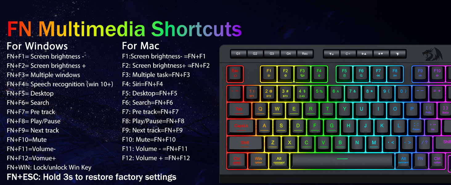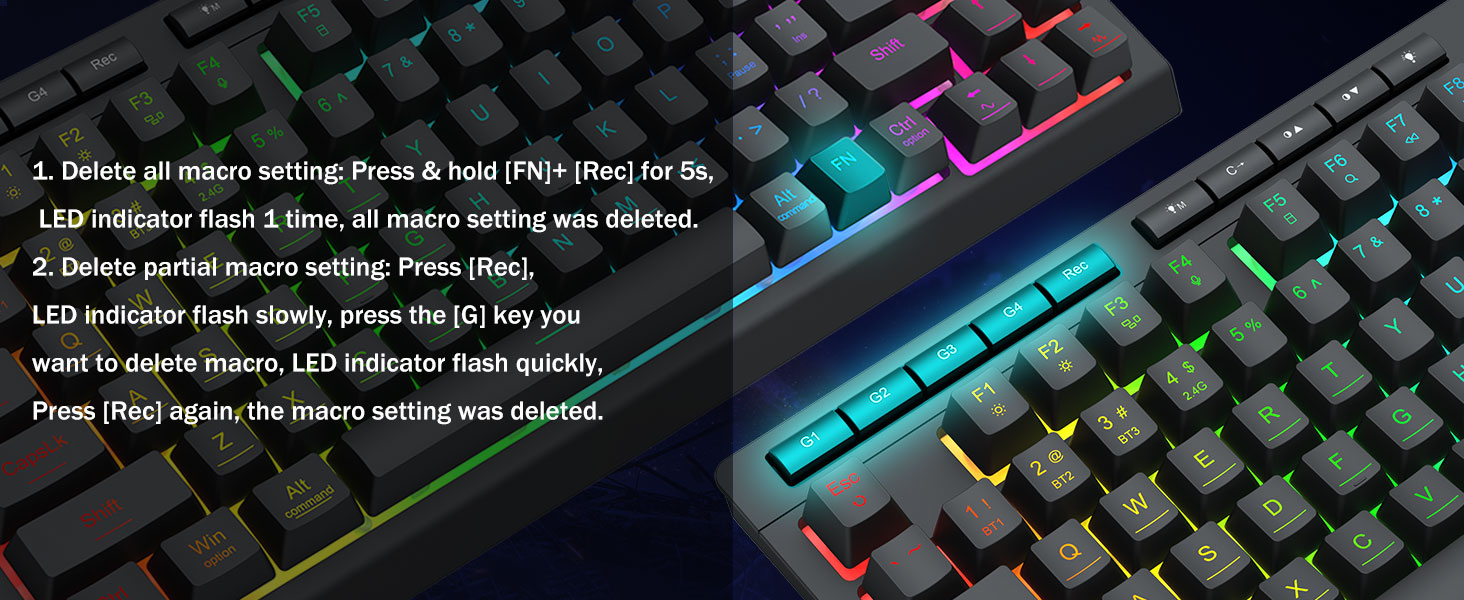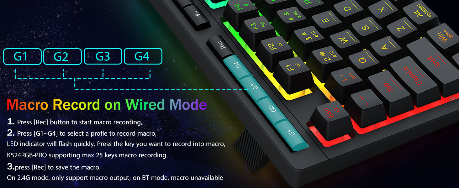 사용자 정의 가능한 매크로, 손쉬운 제어- 4개의 온보드 매크로 키(G1-G4)를 즉시 프로그래밍하세요. 소프트웨어가 필요하지 않습니다. 게임을 위한 복잡한 콤보, 생산성을 위한 단축키 또는 미디어 명령을 기록하세요. 몇 초 안에 워크플로를 재정의하세요. 소프트웨어를 사용하여 기능을 사용자 정의하고, 매크로를 생성하고, RGB 조명을 조정하고, 단축키를 설정할 수도 있습니다.