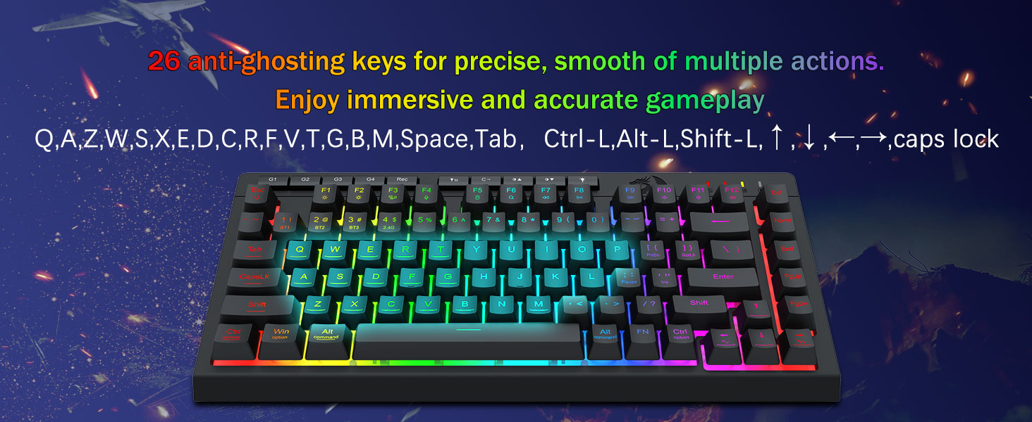 프로급 게이밍 성능 및 전용 백라이트 컨트롤- 의도한 대로 빠르고 정확한 게임 응답을 위해 26개의 키가 동시에 작동할 수 있는 안티 고스팅 키(밑줄이 있는 키) 기능이 있습니다. 밝기, 조명 모드 및 게임 모드에 대한 빠른 액세스 버튼을 사용하면 버튼 터치만으로 밝기, 조명 프로필을 빠르게 조정하고 게임 모드를 활성화할 수 있습니다.