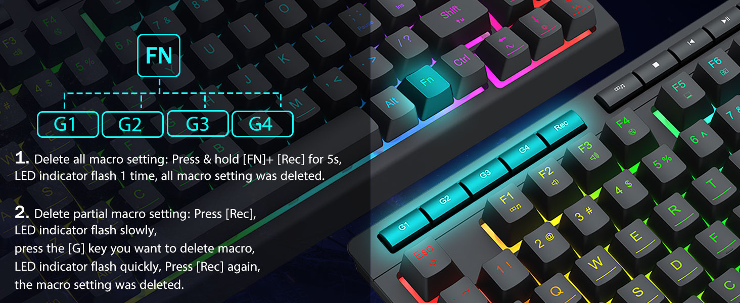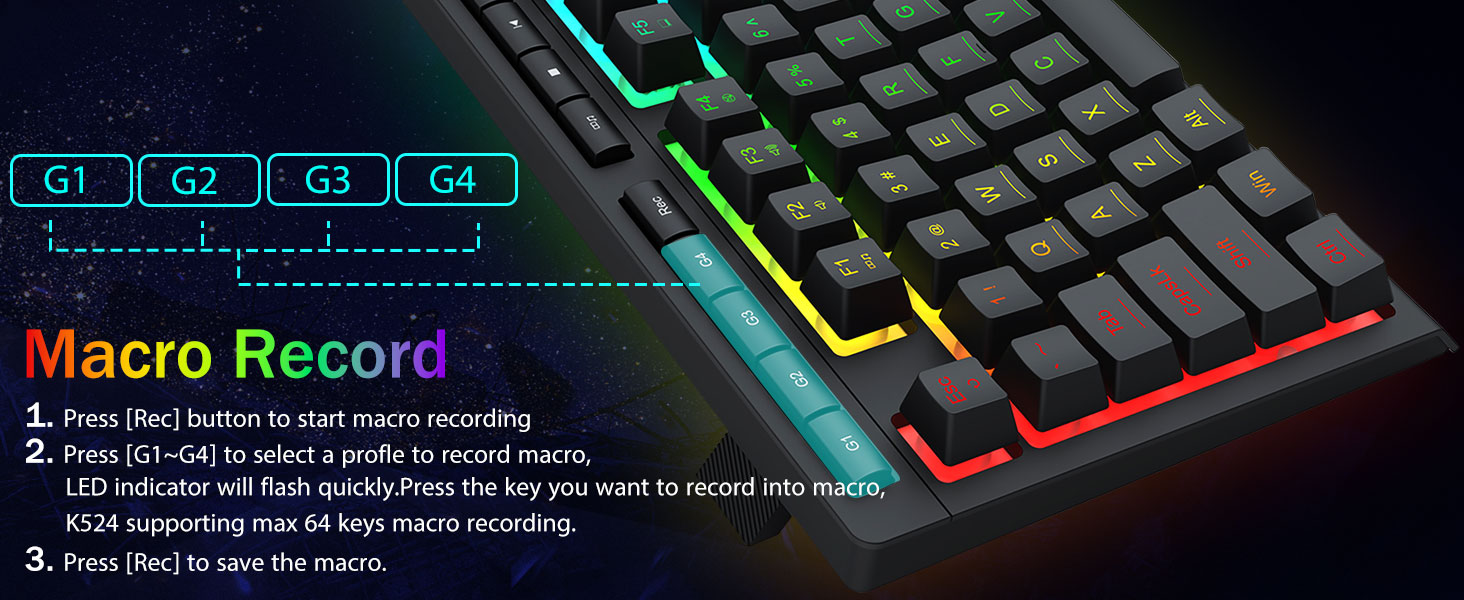 트루 RGB 백라이트 -4개의 온보드 매크로 키(G1~G4)는 프로그래밍 가능하며 추가 소프트웨어 없이 즉시 작동합니다. 키는 편집하기 쉽고 다양한 매크로를 수행할 수 있습니다.
