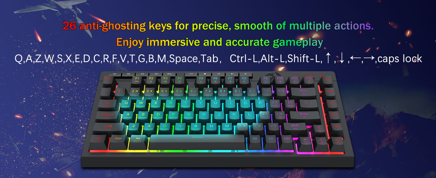 26개 안티 고스트 키 및 전용 미디어 컨트롤 -의도한 대로 빠르고 정확한 게임 반응을 위해 26개의 키가 동시에 작동할 수 있는 안티 고스팅 키(밑줄이 있는 키)가 특징입니다. 전용 미디어 컨트롤을 사용하면 키보드에서 바로 멀티미디어를 재생, 일시 중지, 건너뛸 수 있으므로 게임 플레이가 원활하고 중단되지 않습니다.