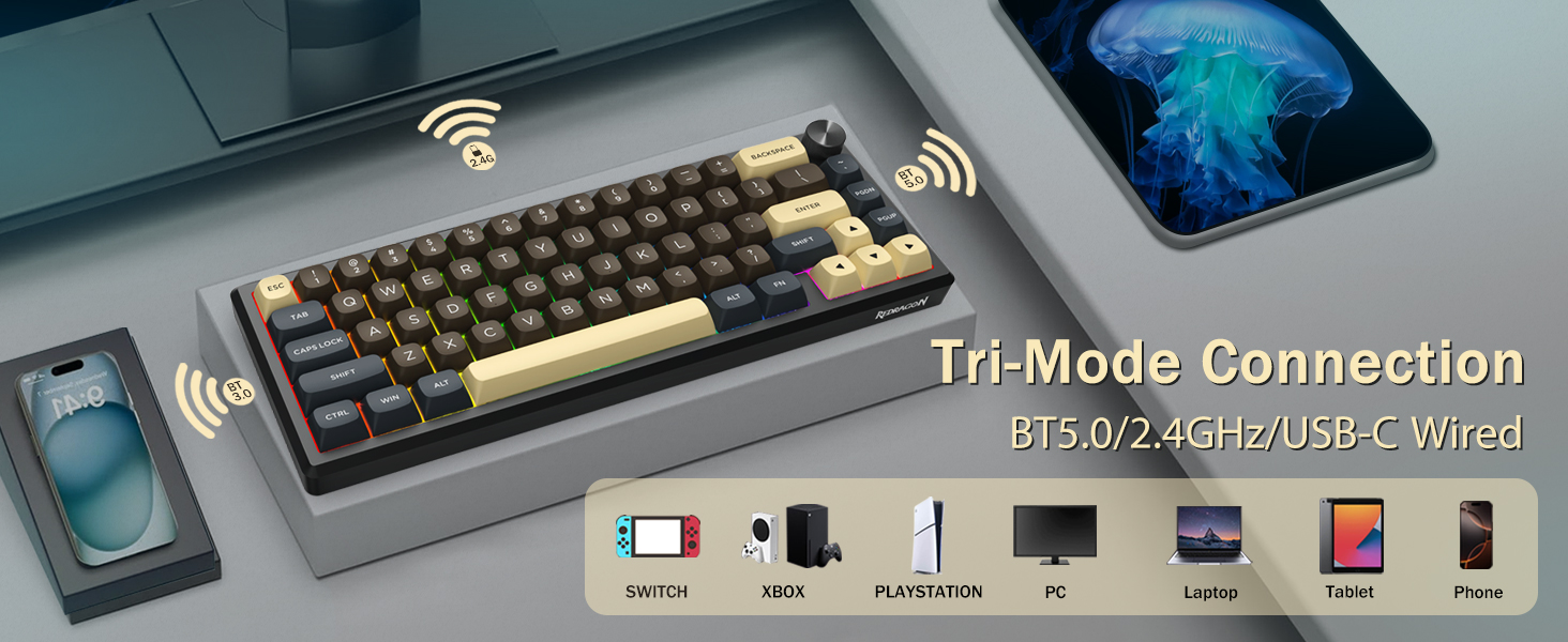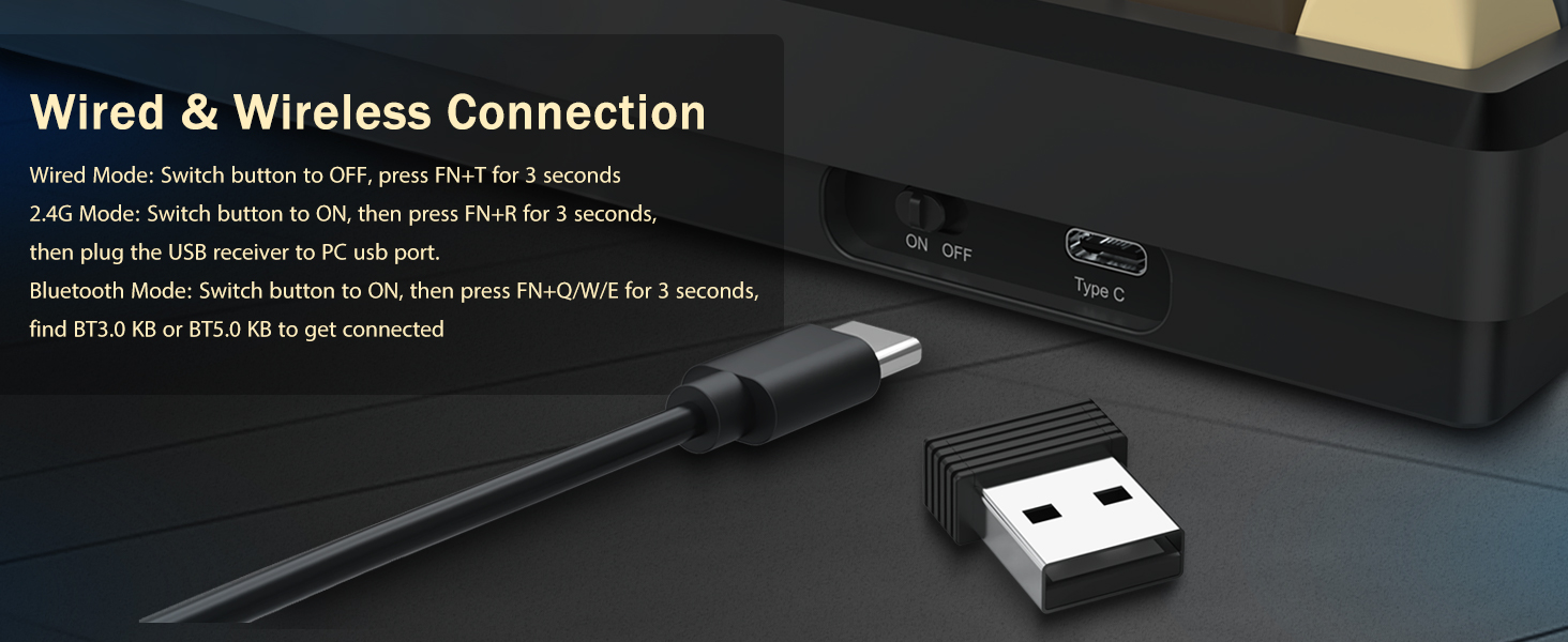 키보드는 편의성을 위해 무선 연결을 지원하고 안정적인 성능을 위해 유선 USB 연결을 지원합니다. 사용자는 설정에 따라 모드를 전환할 수 있습니다.