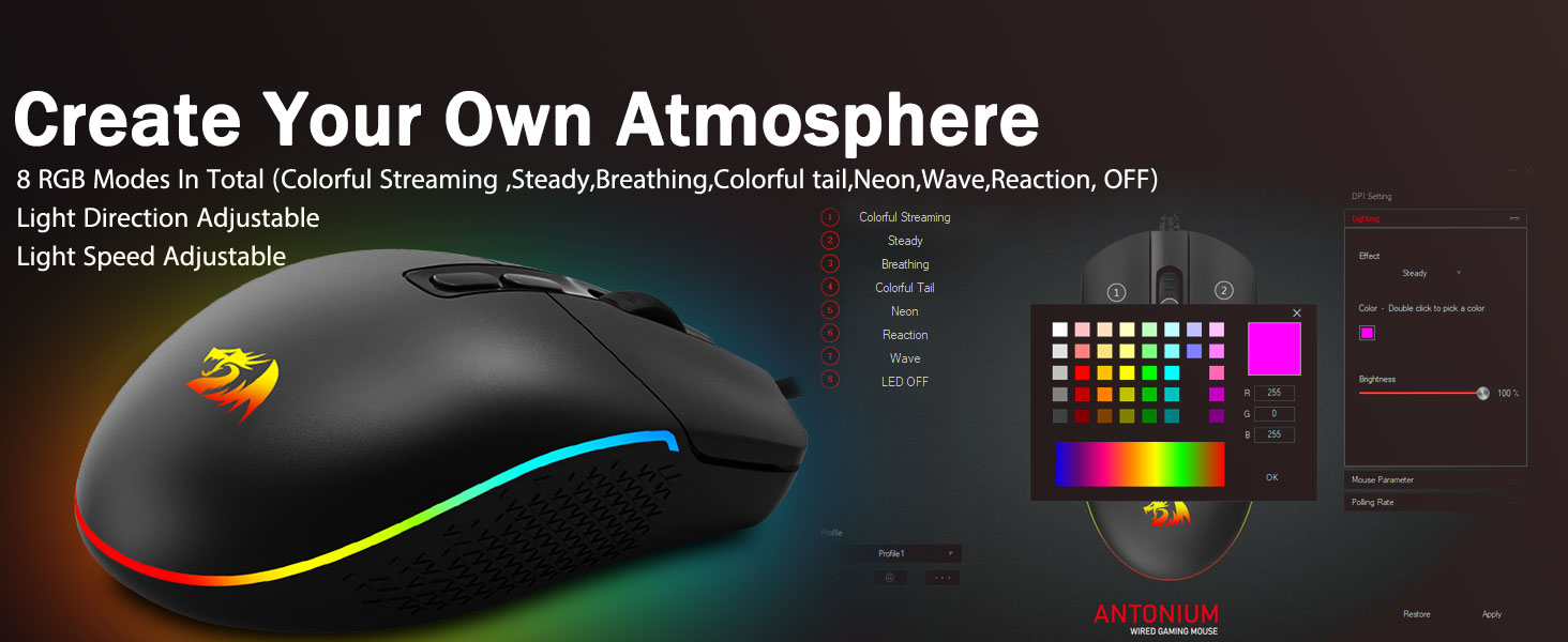 8가지 괜찮은 RGB 백라이트 모드- 백라이트를 켜고 게임 전장에서 적을 처치하세요. 과장된 역동적인 RGB 백라이트 분위기는 게임 공간을 꾸밀 때 결코 실망하지 않을 것입니다. 조명이 켜진 다른 Redragon 액세서리와 함께 사용하면 더 좋을 것입니다.