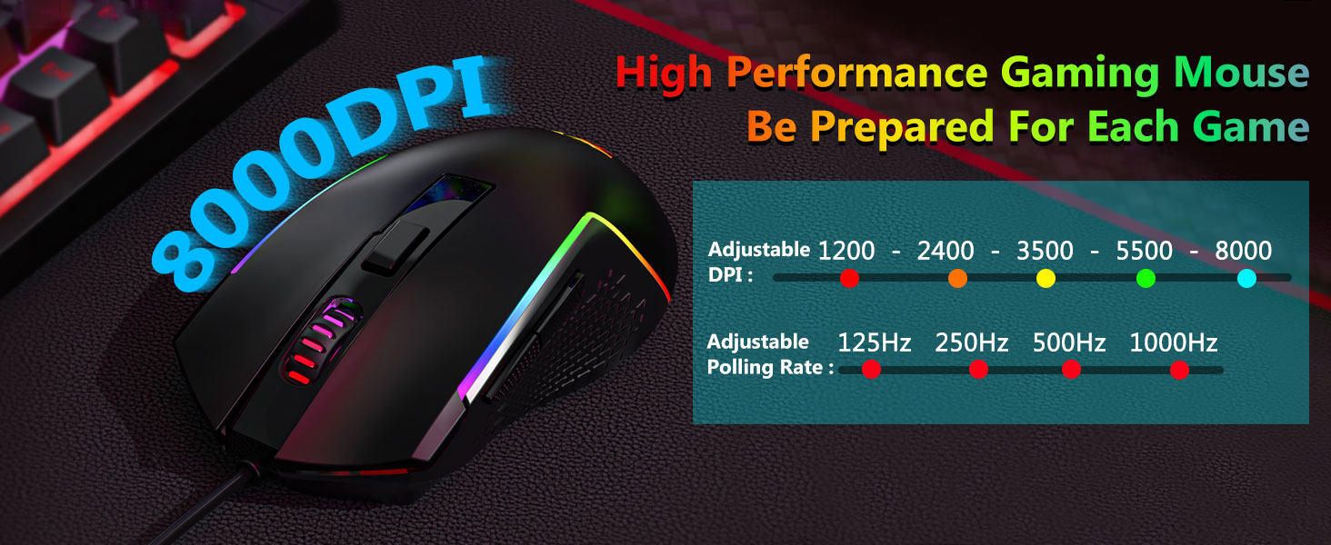【전문 게이밍 마우스】DPI 버튼을 통해 1200에서 8000까지 또는 소프트웨어 드라이버를 통해 100에서 8000까지 DPI를 조정하여 게임이나 작업의 다양한 요구 사항을 쉽게 충족할 수 있습니다. 총 7개의 버튼 중 6개를 프로그래밍할 수 있습니다. 고정밀 센서는 핀포인트 정확도를 제공하는 반면 게임 등급 마이크로 스위치는 수명, 뛰어난 내구성 및 극도의 반응성을 보장하여 경쟁 우위를 더욱 높여줍니다. (소프트웨어는 최대 1000Hz까지 마우스 폴링 속도 조정도 지원합니다.)