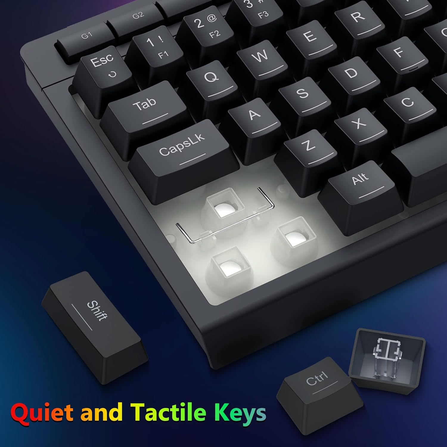 키캡은 내구성과 일관된 질감을 고려하여 설계되어 오랜 시간 동안 편안함을 유지하는 데 도움이 됩니다. RGB 조명이 고르게 분포되어 있어 방해 없이 시인성이 향상됩니다.