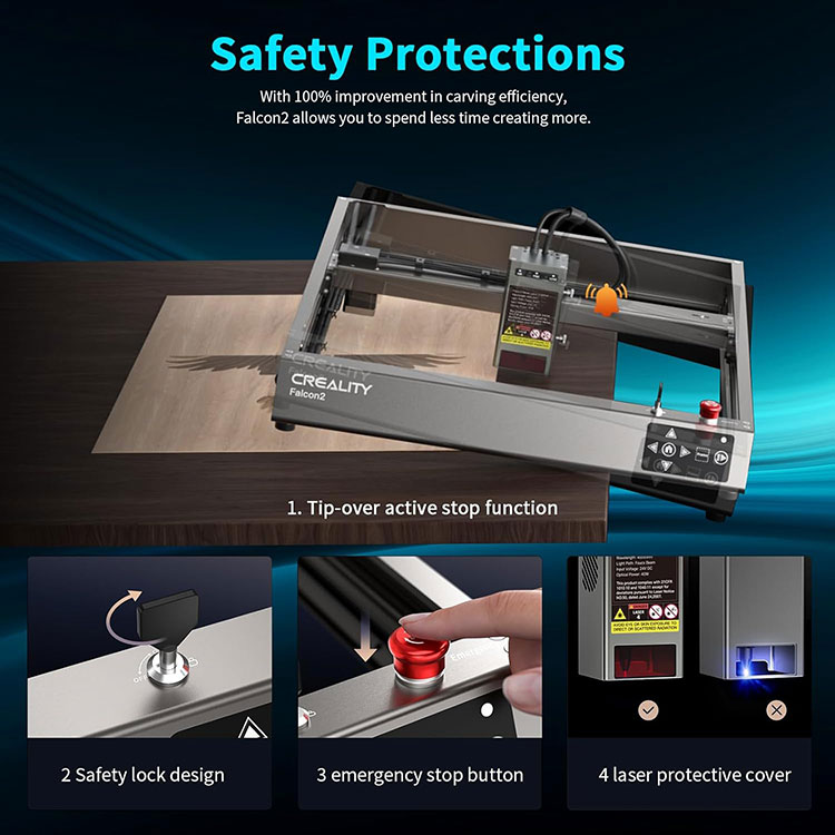· 초고속 레이저 조각사 기계 :Creality Falcon2의 최대 처리 속도는 25000mm/min 생산성에 도달 할 수 있습니다. 2 배 빠른 조각 속도로 조각 작품을 빠르고 잘 완성 할 수 있습니다.