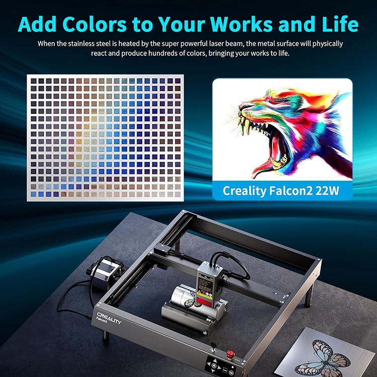 · 화려한 일 화려한 삶 :Creality Laser 조각 기계의 슈퍼 강력한 레이저 빔에 의해 스테인레스 스틸이 가열되면 금속 표면은 물리적으로 반응하여 수백 가지 색상을 생산하여 작품을 생명에 가져옵니다. Creality Falcon2로 창의력을 발휘하십시오.