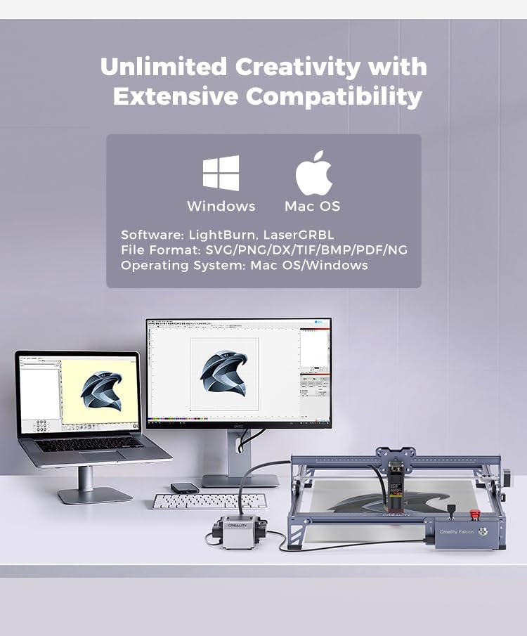 · 【호환성 세부 사항으로 강력하고 내구성이 있음】양극 처리된 알루미늄 합금, L자형 실리콘 풋패드 및 8mm 강철 레일로 정밀하고 부드러운 움직임이 보장됩니다. 내장된 레벨러는 미끄러짐을 방지하고 레이저 조각 장비가 올바르게 배치되었는지 확인하기 위해 보정됩니다. 패키지를 얻은 후에는 직접 설치해야 합니다. 완료하는 데 약 10분이 소요됩니다. Creality falcon 레이저 조각기는 숙련된 레이저 사용자를 위한 LightBurn과 새로운 레이저 사용자를 위한 LaserGRBL을 포함한 다양한 조각 프로그램과 호환됩니다.