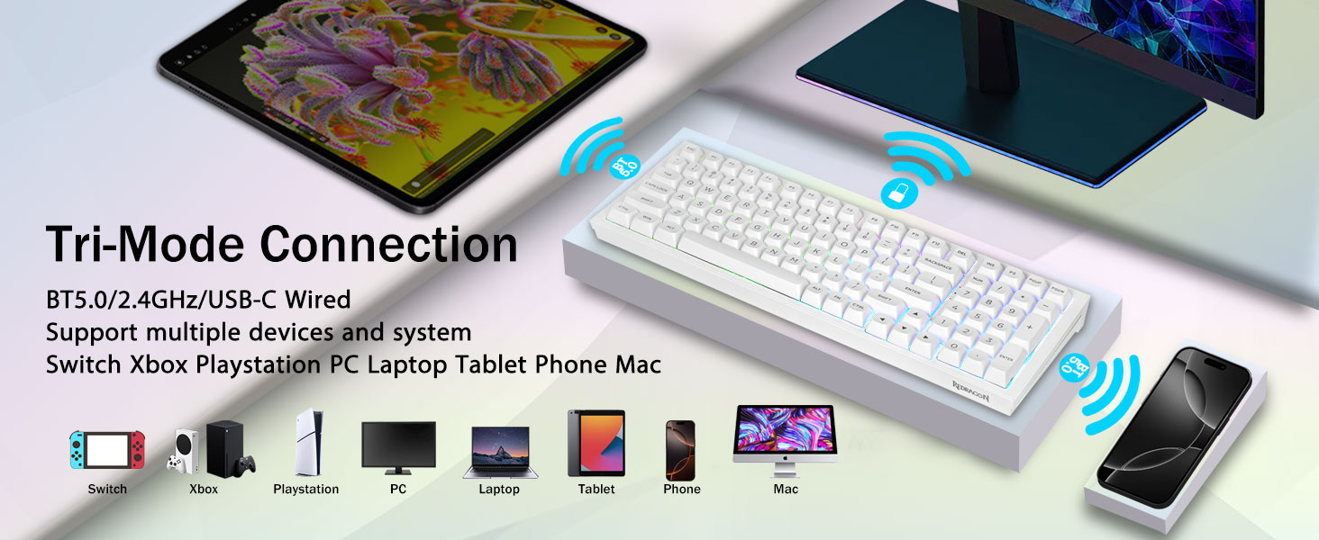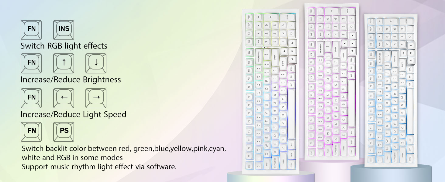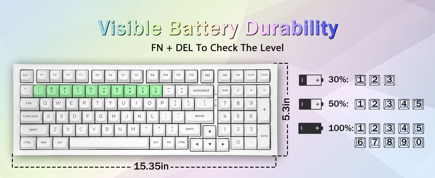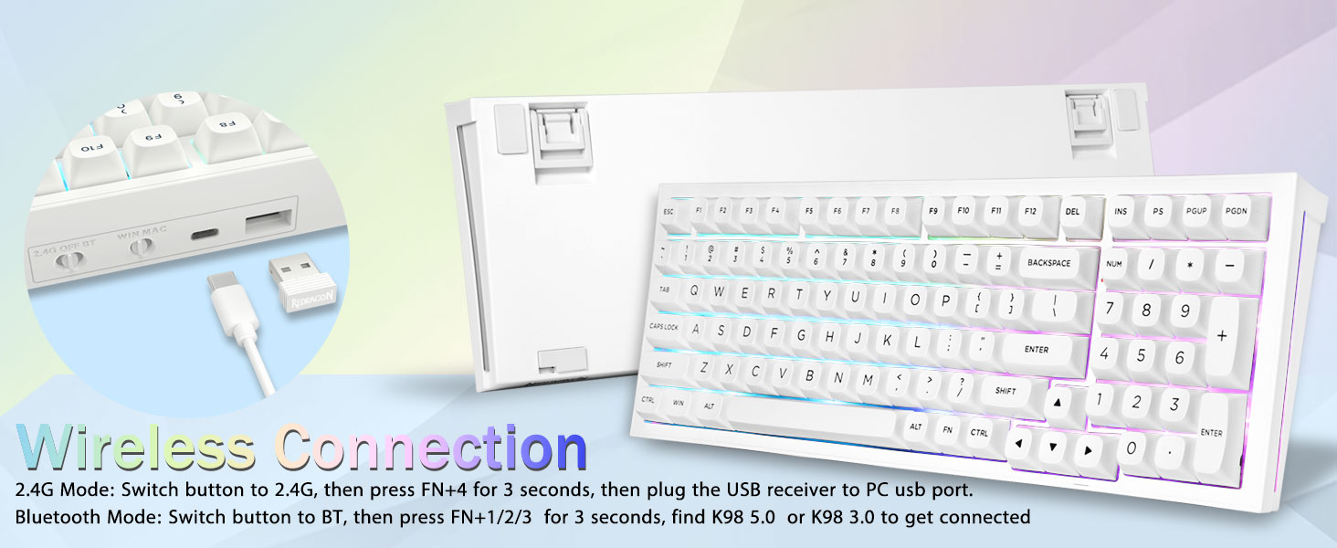 다중 장치 연결:99개 키 96% 레이아웃 컴팩트 키보드는 게임과 작업에 필요한 화살표 키와 숫자 영역을 유지하면서 데스크탑 공간을 더 많이 절약할 수 있습니다. 충전식 키보드에는 4000mAh 대용량 배터리가 내장되어 있어 더 많은 전력과 더 긴 배터리 수명을 제공합니다. 두 가지 색상의 소재를 서로 성형하여 만든 이중 샷 PBT 키캡은 키캡 문자가 선명하고 퇴색되지 않고 생동감과 채도를 유지하도록 해줍니다.