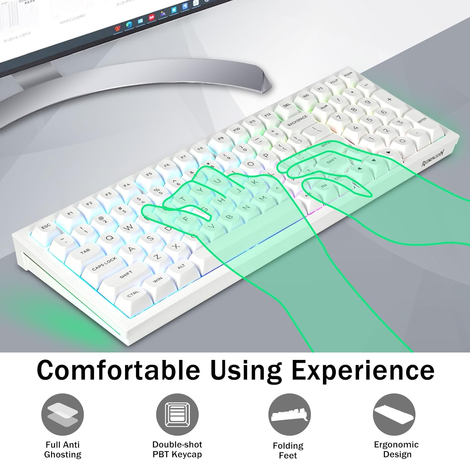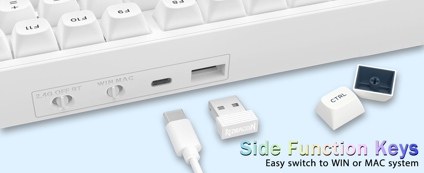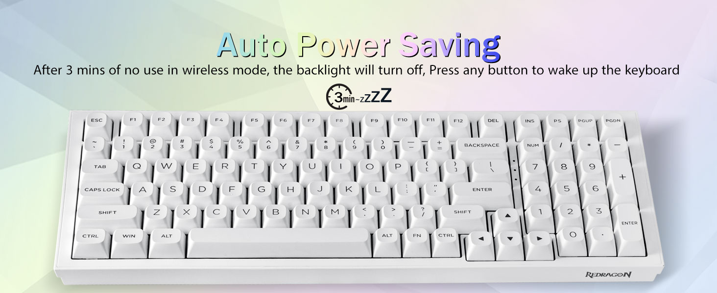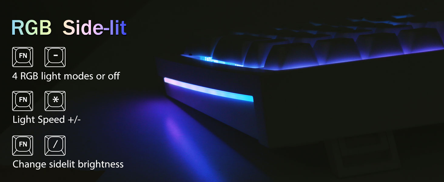 다중 장치 연결:99개 키 96% 레이아웃 컴팩트 키보드는 게임과 작업에 필요한 화살표 키와 숫자 영역을 유지하면서 데스크탑 공간을 더 많이 절약할 수 있습니다. 충전식 키보드에는 4000mAh 대용량 배터리가 내장되어 있어 더 많은 전력과 더 긴 배터리 수명을 제공합니다. 두 가지 색상의 소재를 서로 성형하여 만든 이중 샷 PBT 키캡은 키캡 문자가 선명하고 퇴색되지 않고 생동감과 채도를 유지하도록 해줍니다.