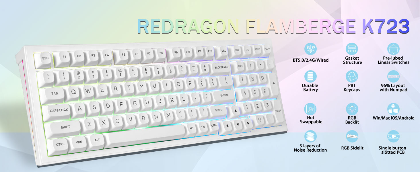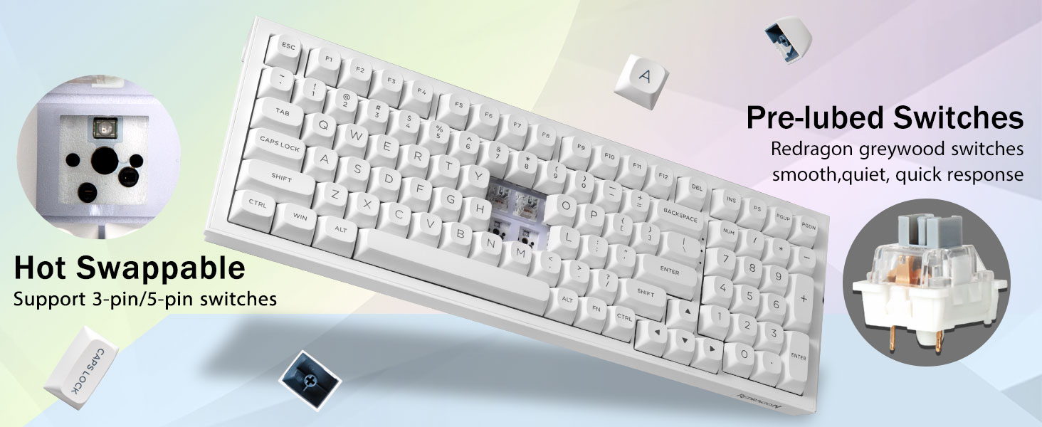 핫스왑 가능한 맞춤형 키보드:스위치와 키캡은 자유롭게 교체할 수 있습니다(키캡/스위치 풀러는 패키지에 포함되어 있습니다). 핫스왑 PCB가 포함된 이 맞춤형 키보드를 사용하면 납땜 문제 없이 3핀/5핀 스위치를 쉽게 교체할 수 있습니다. 미리 윤활 처리된 선형 스위치가 장착된 K723 기계식 키보드는 부드러운 타이핑 느낌과 쾌적한 타이핑 사운드를 제공하고 흥미진진한 게임에 대한 빠른 응답을 제공합니다.