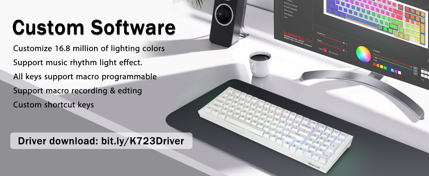 기계식 게이밍 키보드:K723은 업무와 게임 모두를 위한 프리미엄 기계식 키보드입니다. 16개의 RGB 조명 효과로 게임룸에 멋진 분위기를 더해줍니다. 키는 매크로 기록 및 편집이 가능한 매크로 사용자 정의를 지원하고, 키 기능과 1,680만 개의 조명 색상을 사용자 정의하고, 드라이버를 통해 멋진 음악 리듬 조명 효과를 지원합니다. N 키 롤오버, 키보드는 동시에 여러 키 누르기에 반응할 수 있어 매우 흥미로운 실시간 게임에 도움이 됩니다.