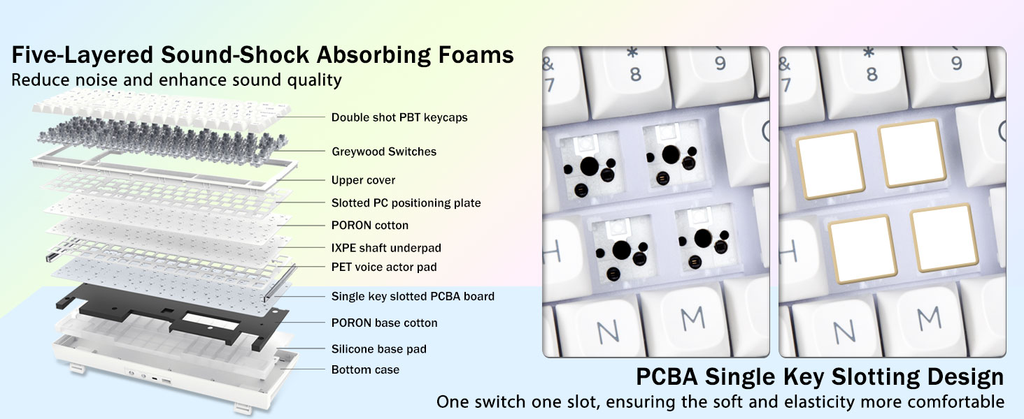 개스킷 구조 및 PCB 단일 키 슬롯:이 컴퓨터 키보드는 개스킷 구조, 확장된 통합 실리콘 패드 및 PCB 단일 키 슬롯을 특징으로 하며 탄력성과 안정성을 더욱 최적화하여 손이 더 부드럽고 탄력있게 느껴집니다. 5겹의 충진 소음기가 PCB, 포지셔닝 플레이트 및 샤프트 사이의 간격을 채워 포지셔닝 플레이트에 부딪히는 샤프트의 캐비티 소음을 효과적으로 상쇄하고 견고한 느낌을 제공합니다.