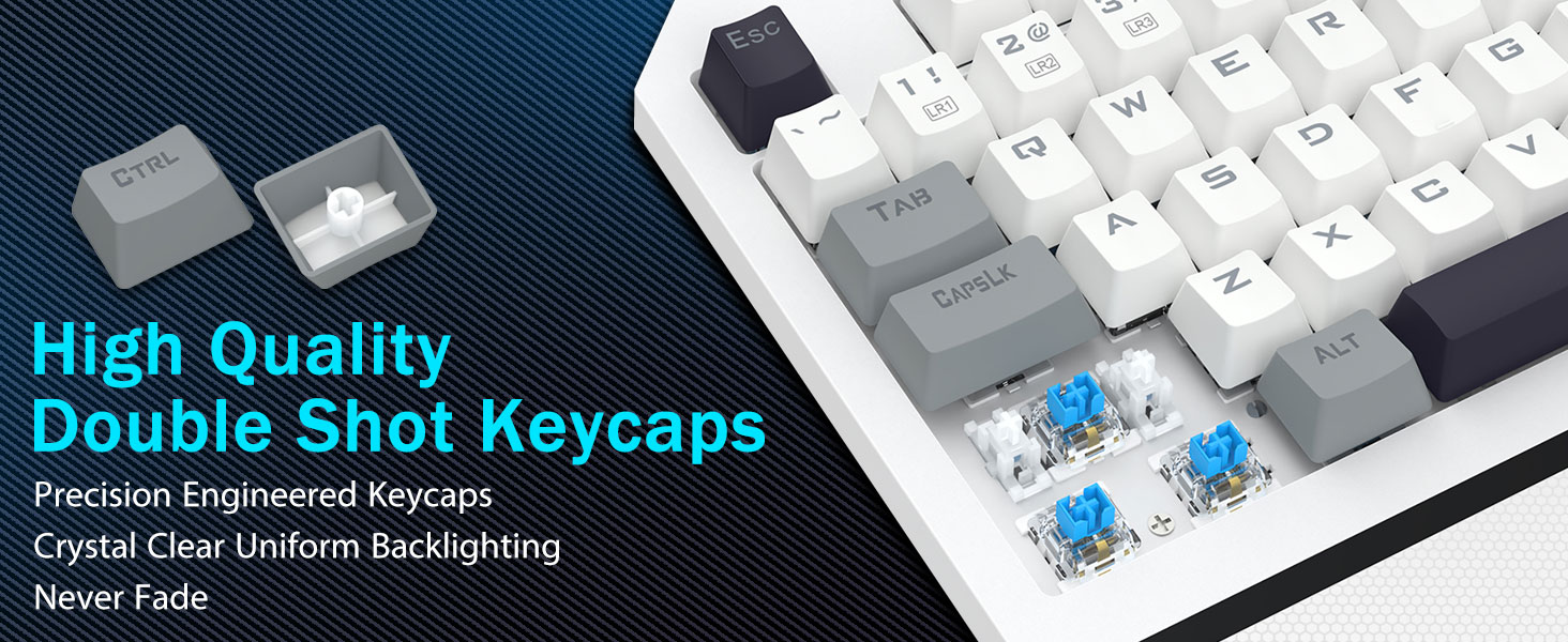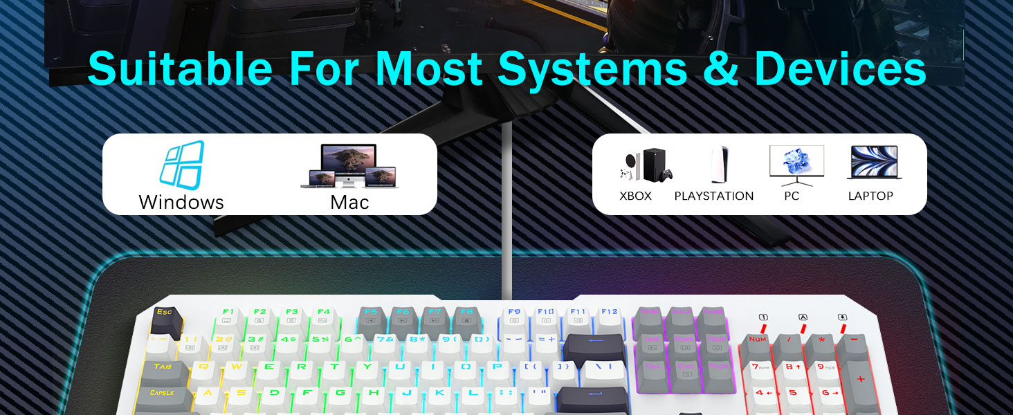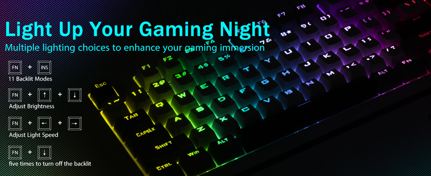 【몰입적인 경험을 위한 레인보우 백라이트 키보드】11가지 동적 백라이트 모드, 5단계 속도 및 밝기 조정 가능으로 데스크탑을 밝게 비춰보세요. 이 키보드는 특히 조명이 어두운 환경에서 기분과 몰입감을 향상시켜 게임 설정의 판도를 바꿔줍니다. 내구성이 뛰어난 이중 주입 ABS 키캡은 깨끗하고 균일한 백라이트를 보장하여 어둠 속에서도 타이핑 정확도를 향상시킵니다.