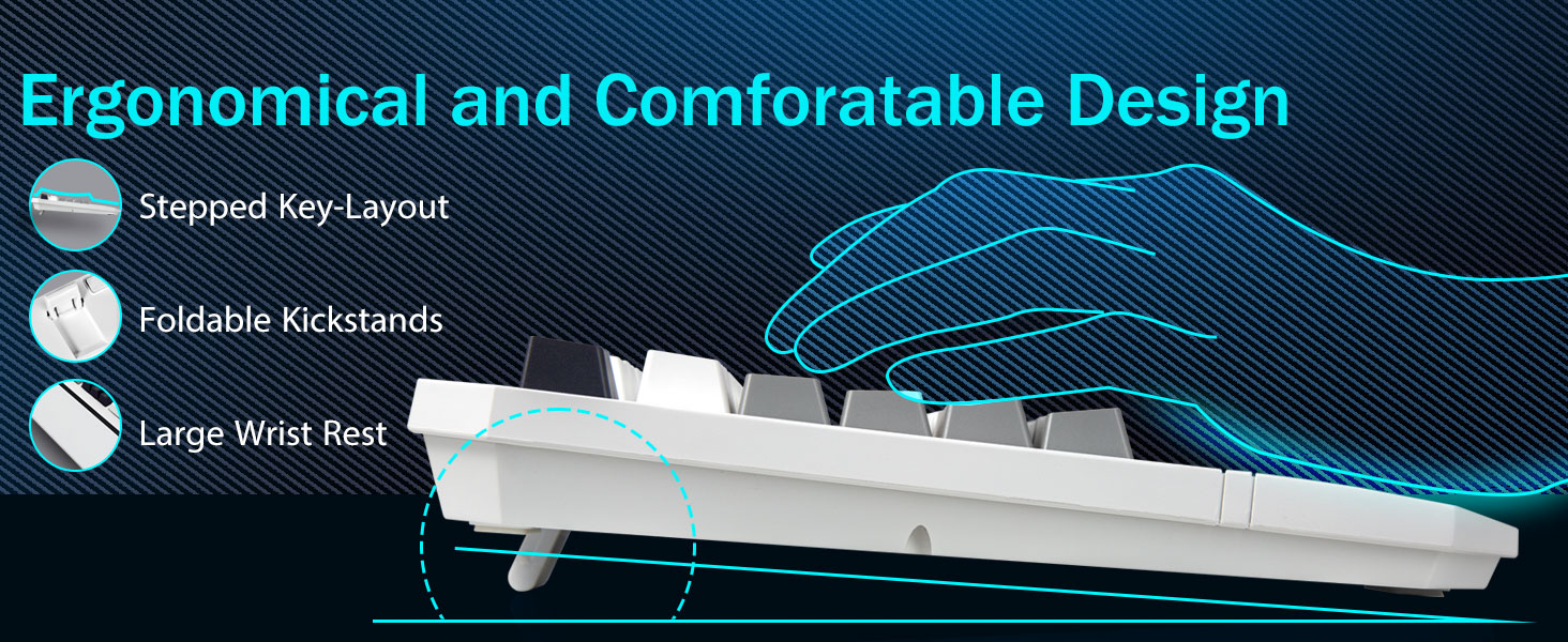 【하루 종일 편안함을 위한 고급 인체공학적 설계】사용자의 편안함을 염두에 두고 설계된 당사의 PC 게이머 키보드는 과학적인 계단식 키캡 레이아웃과 넓은 손목 받침대를 갖추고 있습니다. 이 설정은 팔을 자연스러운 위치에 유지하여 장시간 사용 중에 손의 피로를 줄여줍니다. 유선 키보드에는 견고한 접이식 후면 킥스탠드 2개가 함께 제공되어 최적의 자세를 위해 기울기를 조정할 수 있습니다.