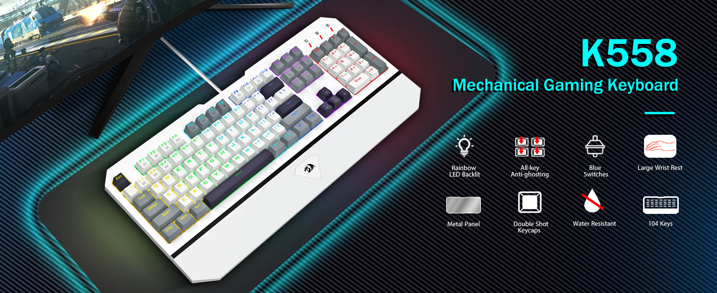 【100% 안티 고스팅 및 11가지 멀티미디어 단축키】100% 안티 고스팅 기술로 입력 속도에 관계없이 모든 키가 동시에 등록되므로 원활한 타이핑을 즐겨보세요. 11개의 멀티미디어 키 단축키를 사용하면 계산기, 미디어 제어, 볼륨 조정과 같은 기능에 빠르게 액세스할 수 있습니다. 숫자 패드를 갖춘 K558 기계식 게임 키보드는 생산성을 높여줍니다. Windows 7/8/10/XP/VISTA/95/98/2000/ME 및 Mac OS, Xbox 등과 호환되는 이 키보드는 최대 5천만 번의 키 입력 수명을 가집니다.